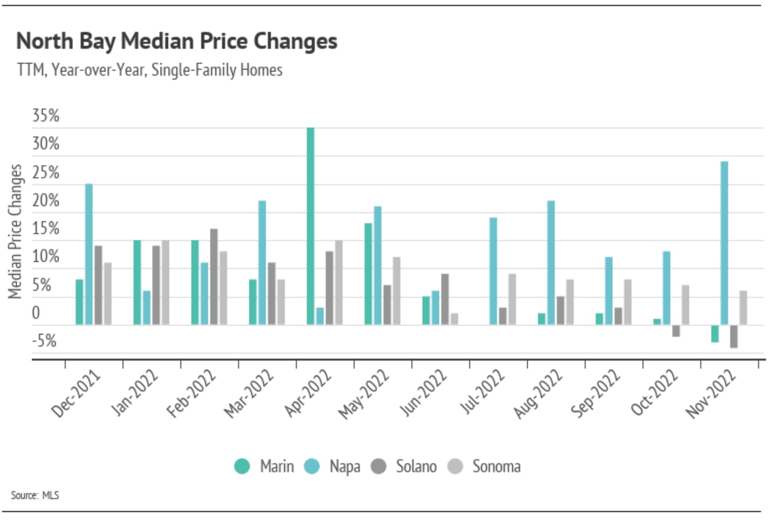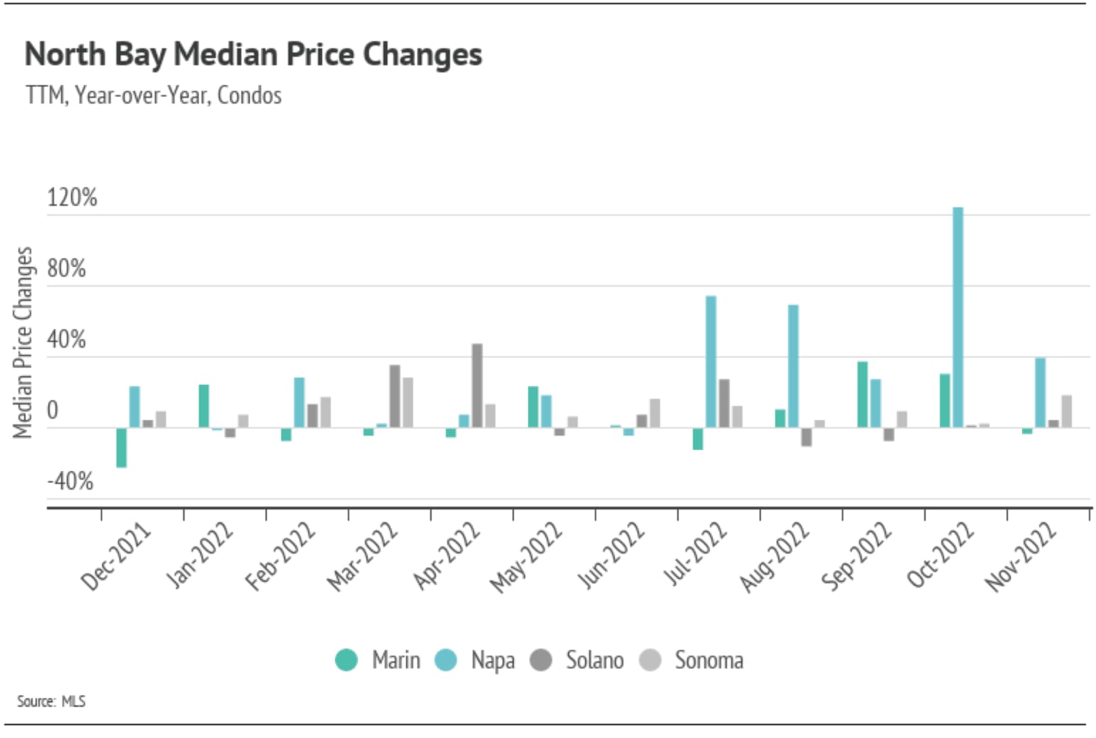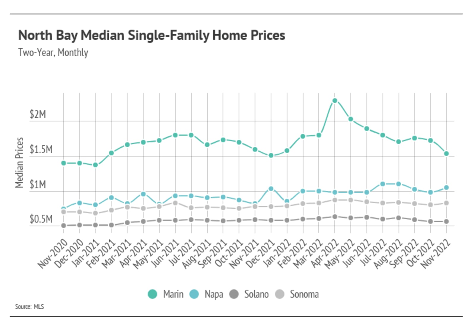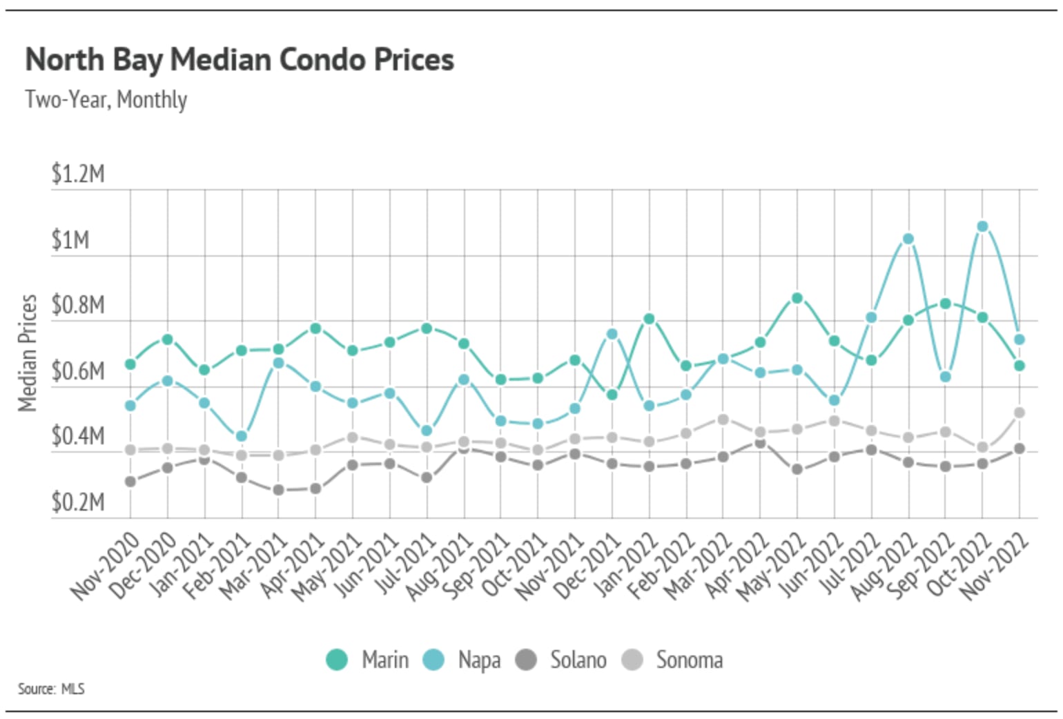 As we mentioned in the Big Story, the market is cooling on both the buy and the sell sides. When there are fewer sellers, there are also fewer buyers, because some buyers are selling their homes to move to others in the same market. New listings have declined faster than sales, causing inventory to decline near the all-time low level we experienced last winter. However, the key difference is that fewer buyers are on the market — so, even with low inventory, buyers can still find the home that’s right for them. The low inventory has insulated prices from a major reversal. In fact, Sonoma condo prices reached an all-time high in November. Although prices have contracted, especially single-family homes in Marin, they have maintained price gains over the past 24 months with the exception of San Mateo condos, which are now lower than in November 2020.