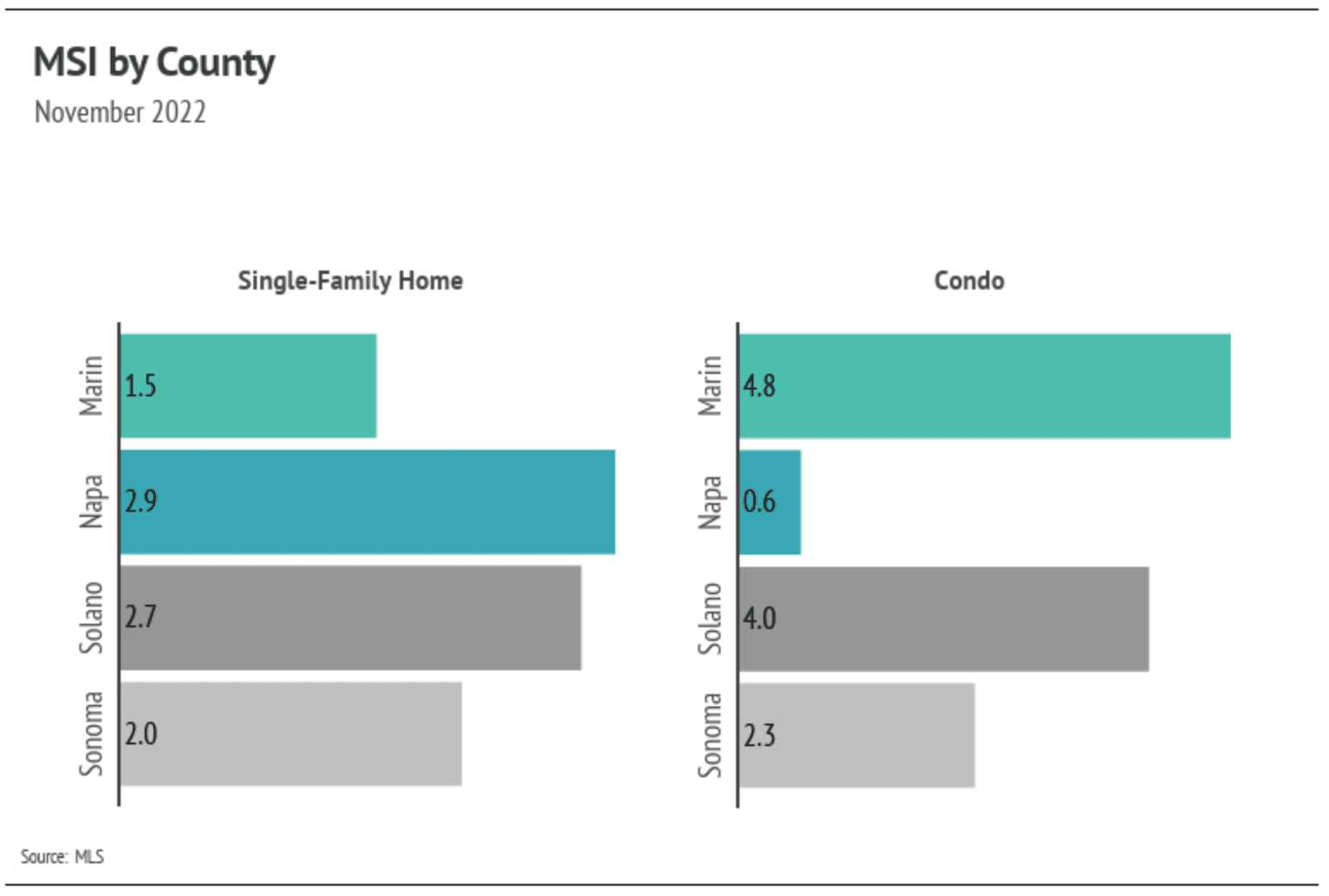 Months of Supply Inventory (MSI) quantifies the supply/demand relationship by measuring how many months it would take for all current homes listed on the market to sell at the current rate of sales. The long-term average MSI is around three months in California, which indicates a balanced market. An MSI lower than three indicates that there are more buyers than sellers on the market (meaning it’s a sellers’ market), while a higher MSI indicates there are more sellers than buyers (meaning it’s a buyers’ market). MSI has trended higher (from a sellers’ market toward balance) since late spring, but despite the changing market environment, North Bay single-family homes still indicate a sellers’ market, but just barely for Napa and Solano counties. The condo markets in Napa and Sonoma are still in a sellers’ market, while the Marin and Solano markets favor buyers.