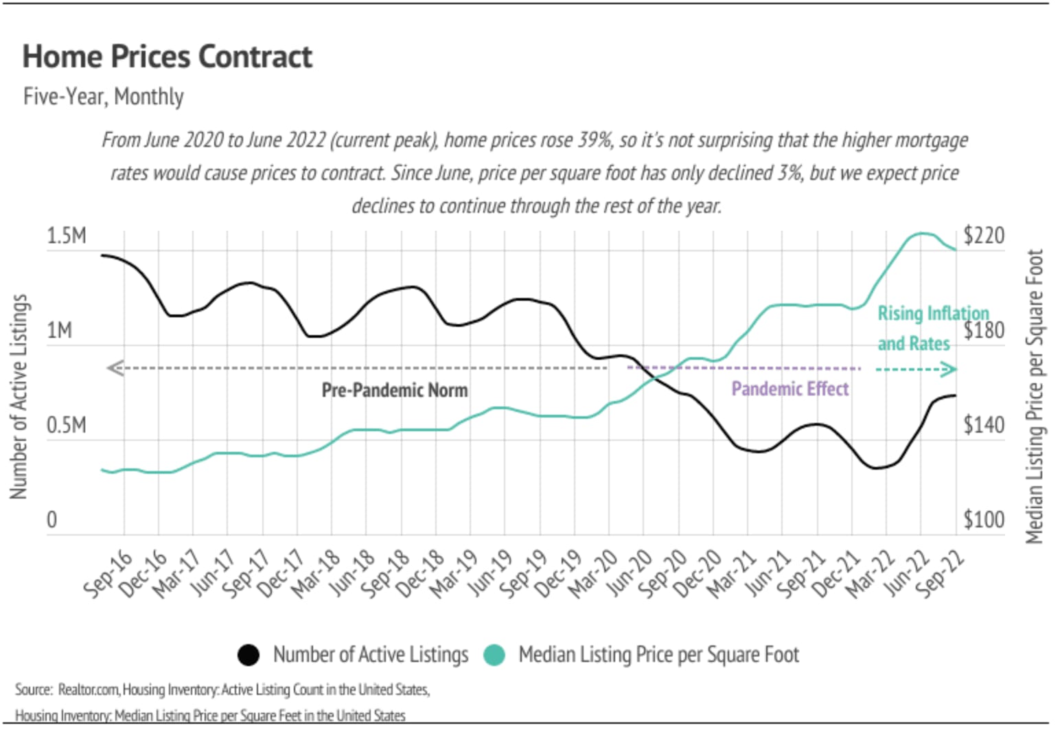 Lastly, the housing market has seasonal trends during which home prices and inventory generally rise in the first half of the year and fall in the second half. We can ascribe some causality for the drop in inventory and prices to seasonality, even though other factors are at play.