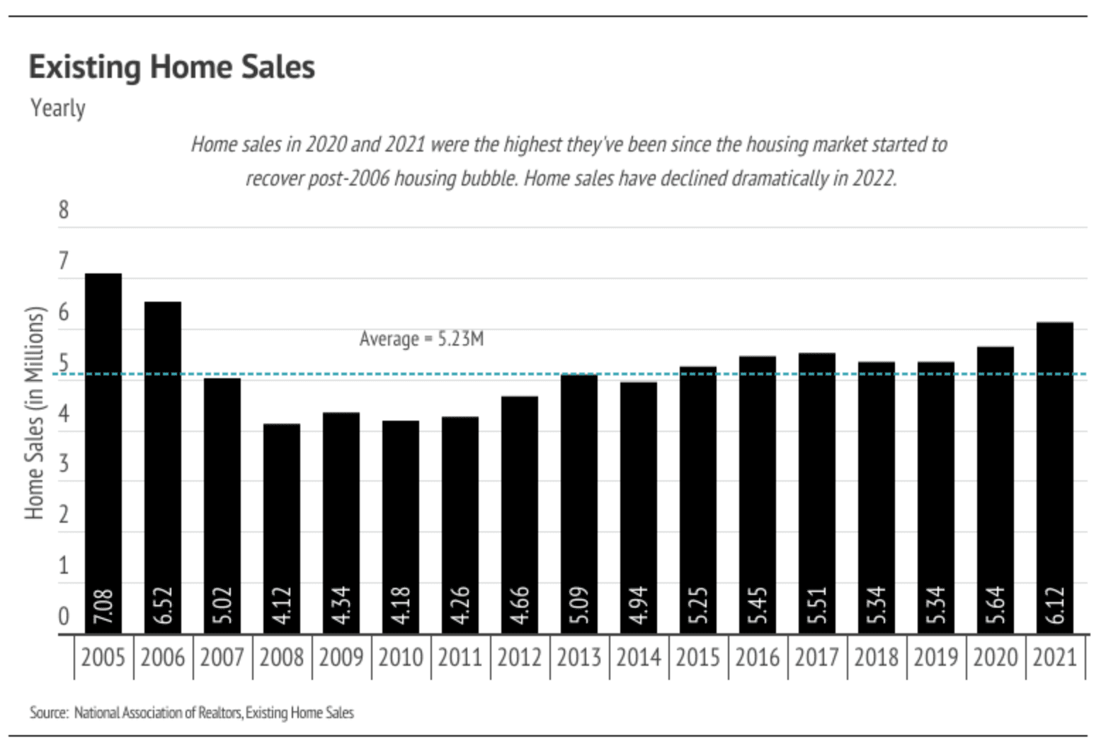The spike in inflation and movement away from COVID restrictions marked the beginning of the end of the white-hot housing market. At the end of 2021, inflation began to rise, and the economy became less reliant on the easy monetary policy the Fed implemented to incentivize spending. This time last year, interest rates were near all-time lows, so whether you were a company issuing debt or a homebuyer taking out a loan, the inflation-adjusted cost of financing was next to nothing. From 2000 to 2020, inflation averaged around 2.1% within a tight range. Even if you lived through the highest inflationary period in U.S. history during the1970s, it’s very unlikely that you can relate to that period now after decades of low inflation. Along with the day-to-day added costs of inflation, the stock market, which is often the largest store of liquid wealth, felt the pain of inflation and economic uncertainty in 2022, now down about 18% on the year as of the end of October.