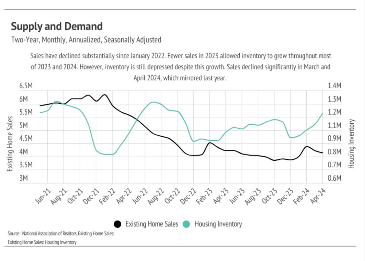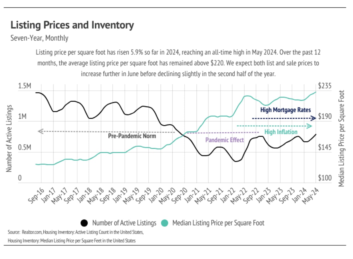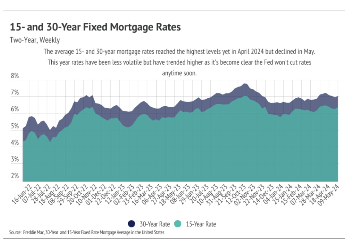 The average 30-year mortgage rate began the year at 6.62% and landed at 7.03% at the end of May, marking the third year mortgage rates have been elevated. At the start of the year, rate expectations were far different from those today. In January, inflation still appeared to be trending lower, and economists were predicting rate cuts as early as March. However, in hindsight, inflation stopped trending lower in June 2023 and has held fairly steady around 3.3% since then. The Fed targets an inflation rate of 2%, so we aren’t expecting rate cuts anytime soon. In fact, the safest bet may be to not expect any rate cuts in 2024. The Fed’s dual mandate aims for stable prices (inflation ~2%) and low unemployment, so it’s all about inflation, especially because the job market is still strong.