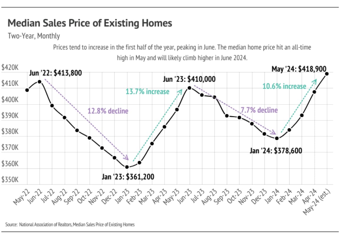 According to the National Association of Realtors® (NAR), the median sales price for existing homes grew 5.6% to $418,900 between May 2023 and the present — the eleventh consecutive month of year-over-year price growth, and the highest median price ever reached. Typically, the median price peaks in June each year, so we will likely see prices climb even higher when the data comes in for this month. In addition to NAR, the Case-Shiller 20-City Composite Home Price Index, which measures the aggregate price level of homes in the largest 20 metropolitan statistical areas, has reached a new high for the eighth month in a row. The combination of elevated mortgage rates and rising prices has brought affordability to an all-time low, which translates to fewer sales and growing inventory. However, at the same time, homes are spending less and less time on the market.