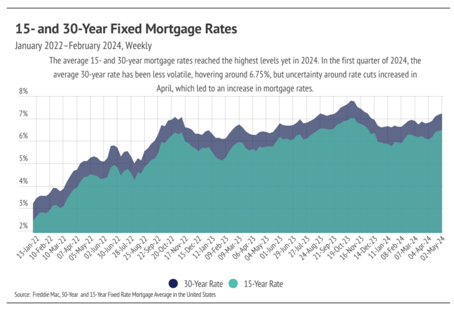 The average 30-year mortgage rate began the year at 6.62%, marking the start of the third year mortgage rates have been elevated. However, the rate expectations for 2024 in January were far different from those today. In January, inflation was still trending lower and economists were predicting rate cuts as early as March. Unfortunately, the inflation rate stopped falling around 3%, never quite reaching the 2% target, which has caused the Fed to delay cutting the federal funds rate, which indirectly, but significantly, influences credit markets. The past two months, in fact, inflation has increased year over year, which isn’t ever going to move the timetable for rate cuts earlier.