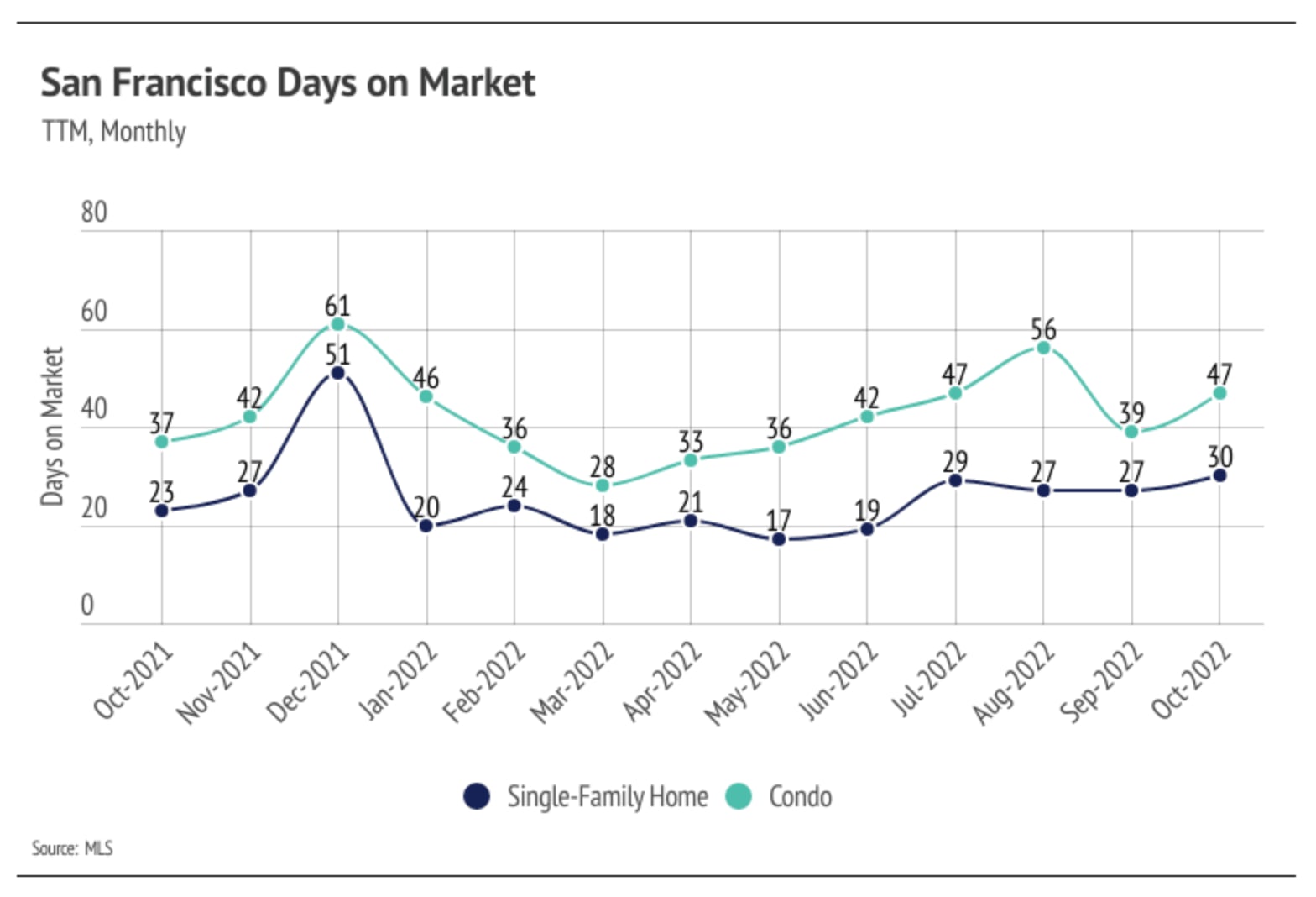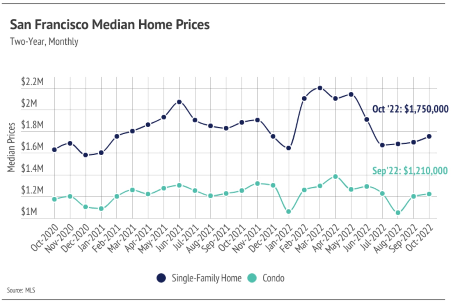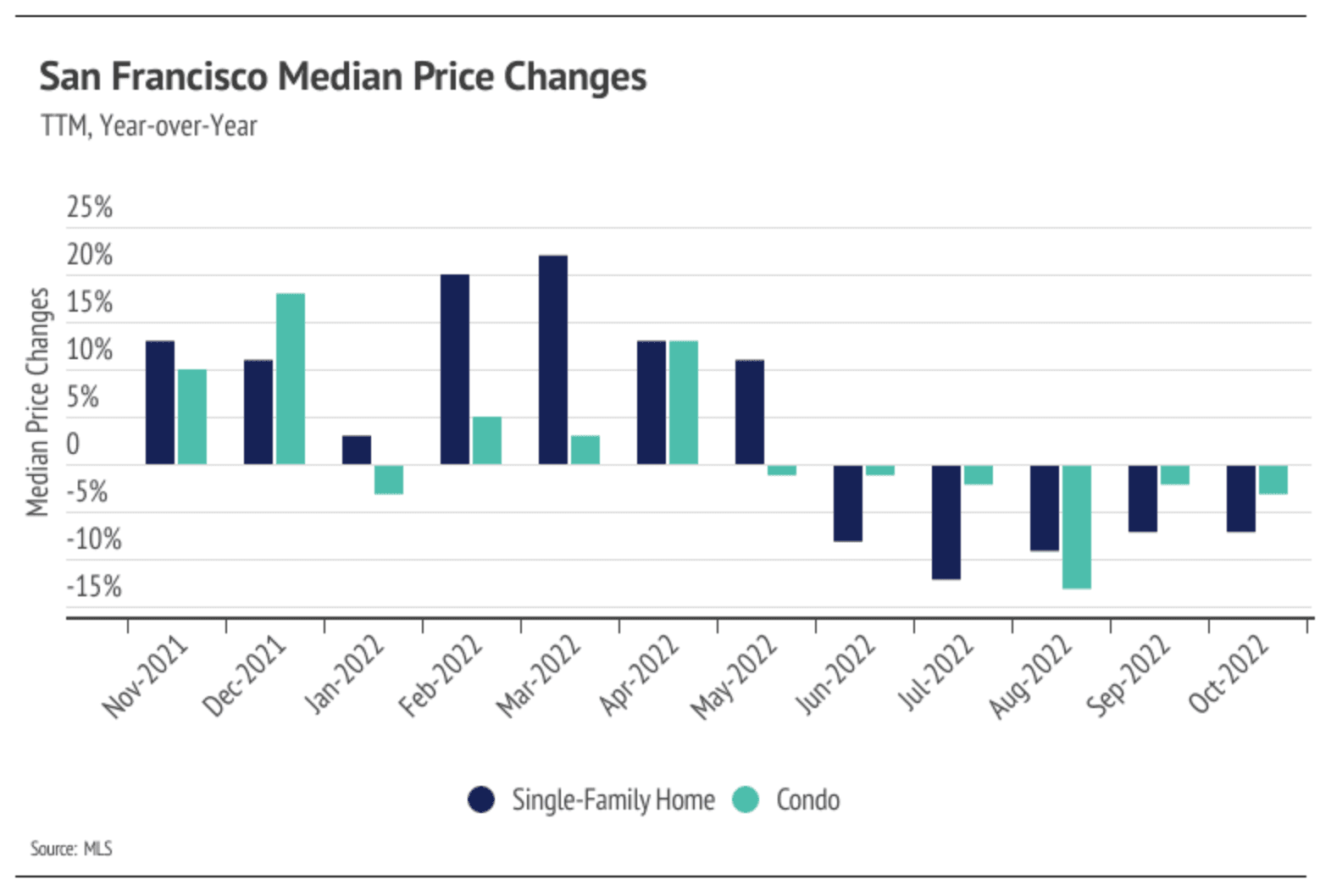 We have enough data to show that the housing market in San Francisco is cooling substantially after one of the hottest real estate markets in history. Of course, you don’t have to be a real estate expert to realize that when interest rates shoot up, fewer buyers will be in the market, which generally puts less upward pressure on prices. Single-family home prices have declined 22% from the March peak, but having risen 35% in the 18 months before the peak, they’re still up 6% over the past two years. Condo prices rose in September and October after a 24% decline from the April high, bringing the total price appreciation over the past 24 months to 4%. Moving forward, prices will likely contract slightly more through the rest of the year, which is typical during the slower holiday season. Home prices in San Francisco grew at an unsustainable rate in 2020 and 2021, and a contraction is a normal response to that sort of growth. We are now entering a stage of slower longer-term growth — but still growth. In the short-term, prices may come down a little more, however. Real estate has shown itself to be one of the best investments in recent history and is, on average, the largest store of wealth for an individual or family. Price appreciation will likely move to a more normal growth rate of around 5-6% in the coming years, which makes for a much healthier market than what occurred in 2020 and 2021.