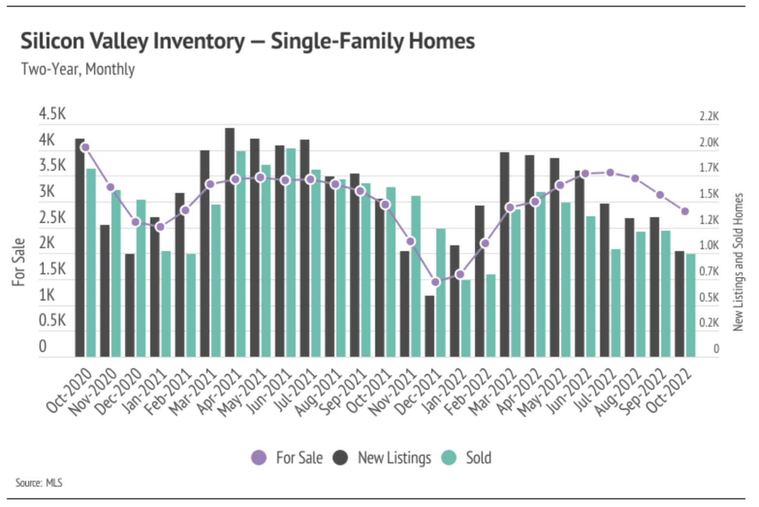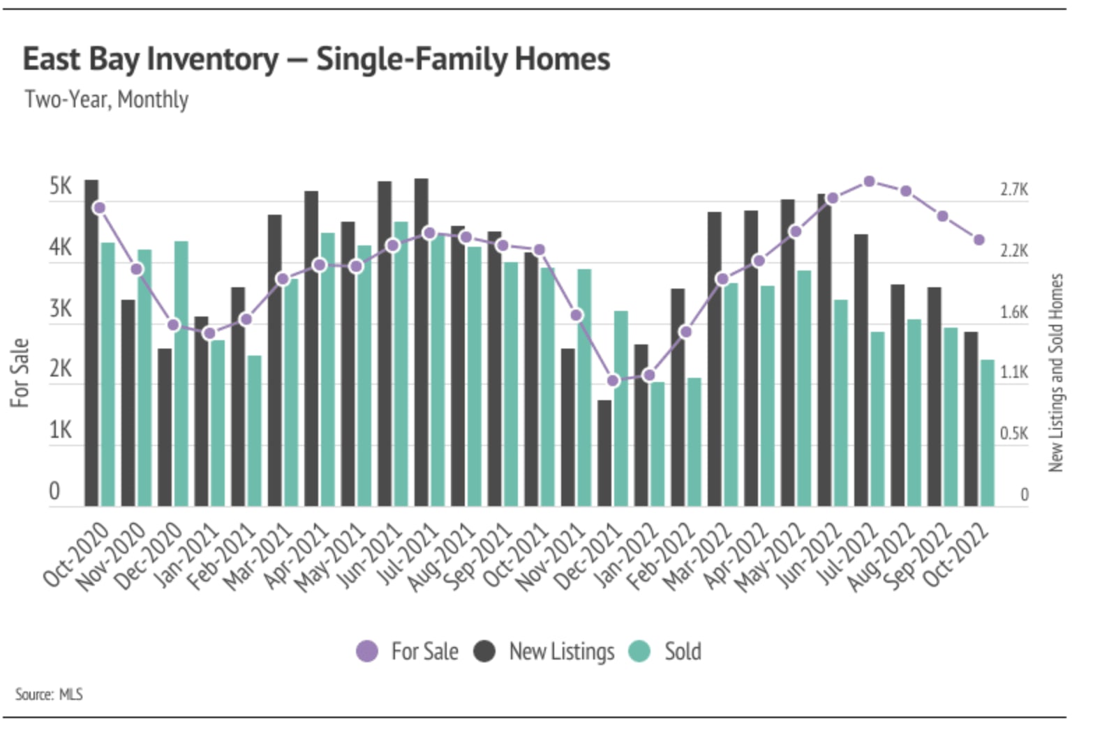 Single-family home and condo sales and new listings declined month-over-month, a trend that will likely continue through the rest of the year. The Bay Area, along with the rest of the country, has not returned to pre-pandemic inventory levels after the buying boom last year. Now that we’re through most of 2022, we can see just how significant sales were in 2021 by comparison, especially in the summer months. From May through September of last year, 35,511 single-family homes and condos sold. During the same period this year, 25,595 homes sold, a 28% decline. Far fewer new homes have come to market in 2022, and the rising rate environment has dropped demand as well. We can tie new listings not only to supply, but also to demand, because sellers are often buying, too. Softening demand has brought the market closer to balance despite declining inventory.