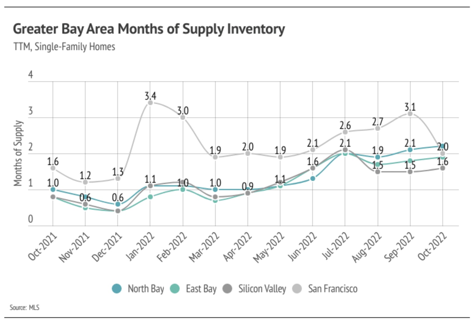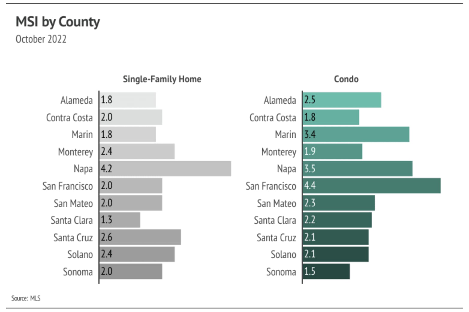 Months of Supply Inventory (MSI) quantifies the supply/demand relationship by measuring how many months it would take for all current homes listed on the market to sell at the current rate of sales. The long-term average MSI is around three months in California, which indicates a balanced market. An MSI lower than three indicates that there are more buyers than sellers on the market (meaning it’s a sellers’ market), while a higher MSI indicates there are more sellers than buyers (meaning it’s a buyers’ market). MSI has trended higher (toward balance) since the spring due to the changing market environment. However, we are still in a sellers’ market for most of the Bay Area, as demand for homes has remained high relative to supply. Currently, MSI indicates a balanced market for Napa condos and a buyers’ market for Napa single-family homes and San Francisco condos.