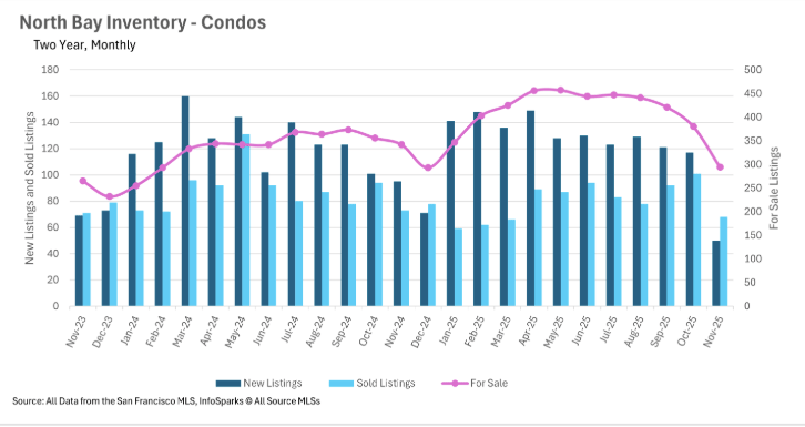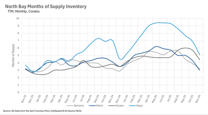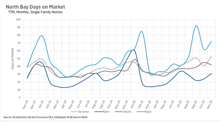 Although the headline here is shocking, it’s not exactly an outlier. We saw substantial year-over-year increases in the amount of time listings are spending on the market across the board. Single family homes are spending considerably more time on the market in Sonoma, Solano, and Napa Counties, with 32.50%, 20%, and 71.46% year-over-year increases in days on market, respectively. However, Marin County seems unphased, with the median home spending 31 days on the market in both November 2024 and November 2025. Likewise, Marin County condos are actually spending less time on the market with a year-over-year decrease of 26.83%!