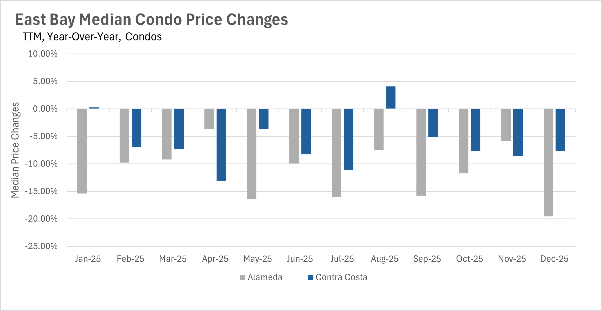 • Single-family home prices held relatively steady in December, while the condo market continued its year-long slide with double-digit declines in Alameda County.