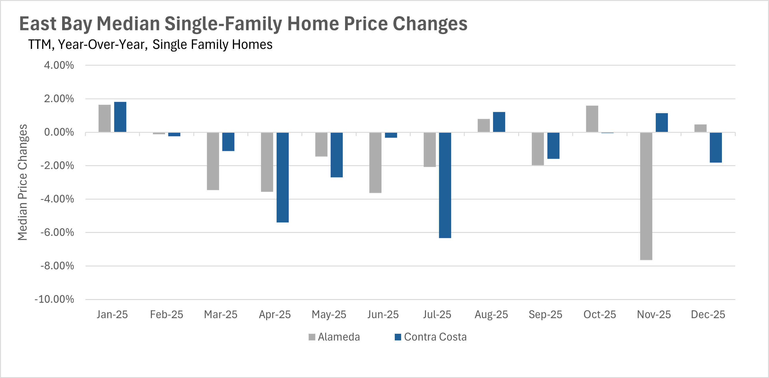 The single-family home market in the East Bay ended the year on a relatively stable note. In December, the median single-family home in Alameda County sold for $1,170,000, representing a modest 0.47% increase on a year-over-year basis. Meanwhile, Contra Costa County saw the median single-family home sell for $839,500, a slight 1.81% decline compared to last year. The condo market, however, tells a very different story. Alameda County condos saw a steep 19.55% year-over-year decline in median sale price, with the median condo selling for just $522,500. Contra Costa County condos fared somewhat better but still declined by 7.60%, with the median condo selling for $462,000. This divergence between single-family homes and condos has been a recurring theme throughout 2025.