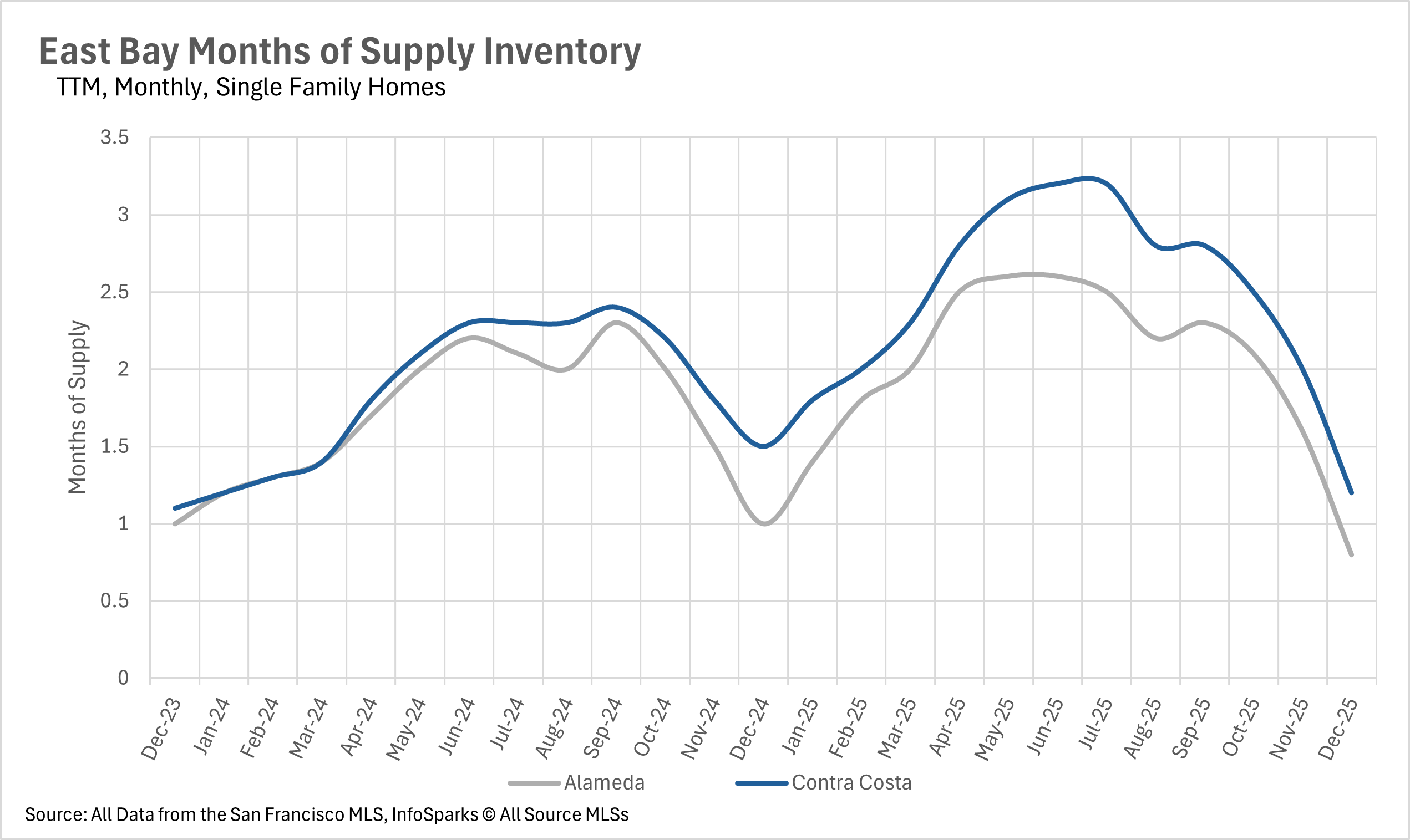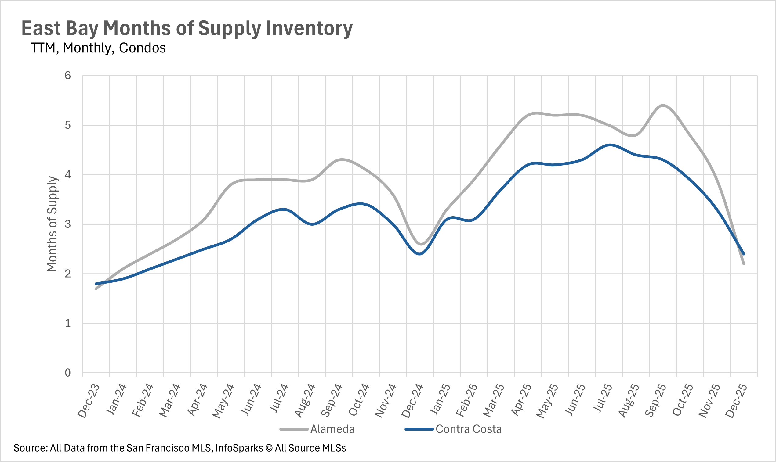 The East Bay ended December as a strong seller's market across the board. The single-family home market is especially tight, with just 0.8 months of inventory in Alameda County and 1.2 months in Contra Costa County. This represents a 20% year-over-year decline in both counties and signals that buyers looking for single-family homes will face stiff competition heading into the new year. Even the condo market, which has struggled throughout 2025, has tightened considerably. Alameda County ended the month with 2.2 months of condo inventory, while Contra Costa County had 2.4 months. Both figures represent significant declines from earlier in the year and put the condo market firmly into seller's market territory as well.