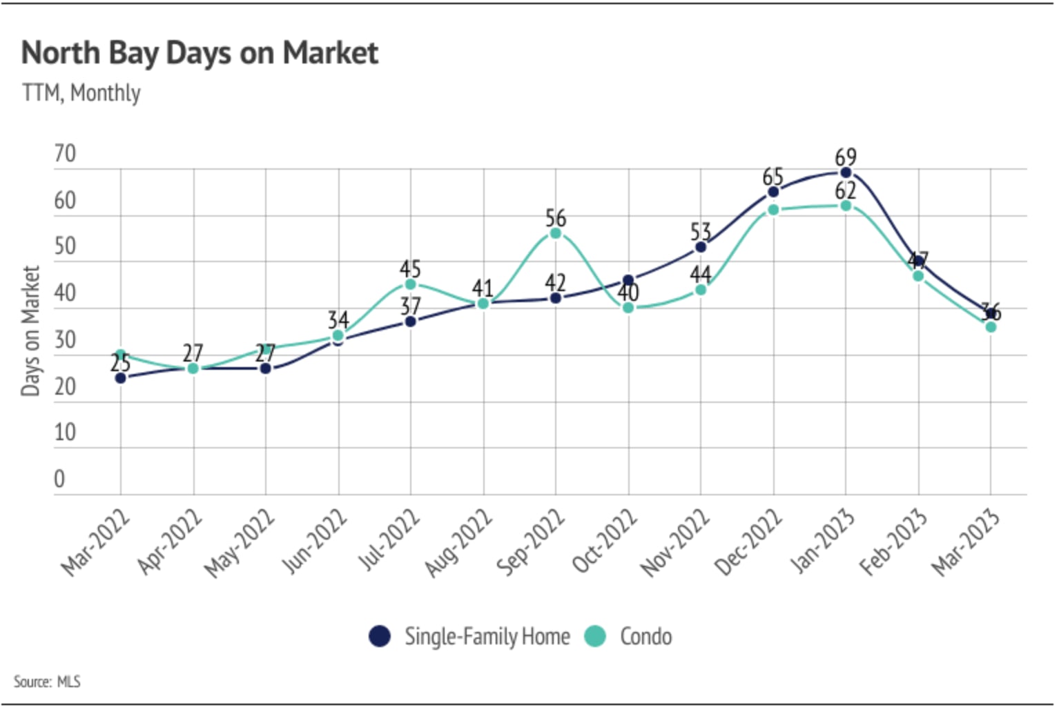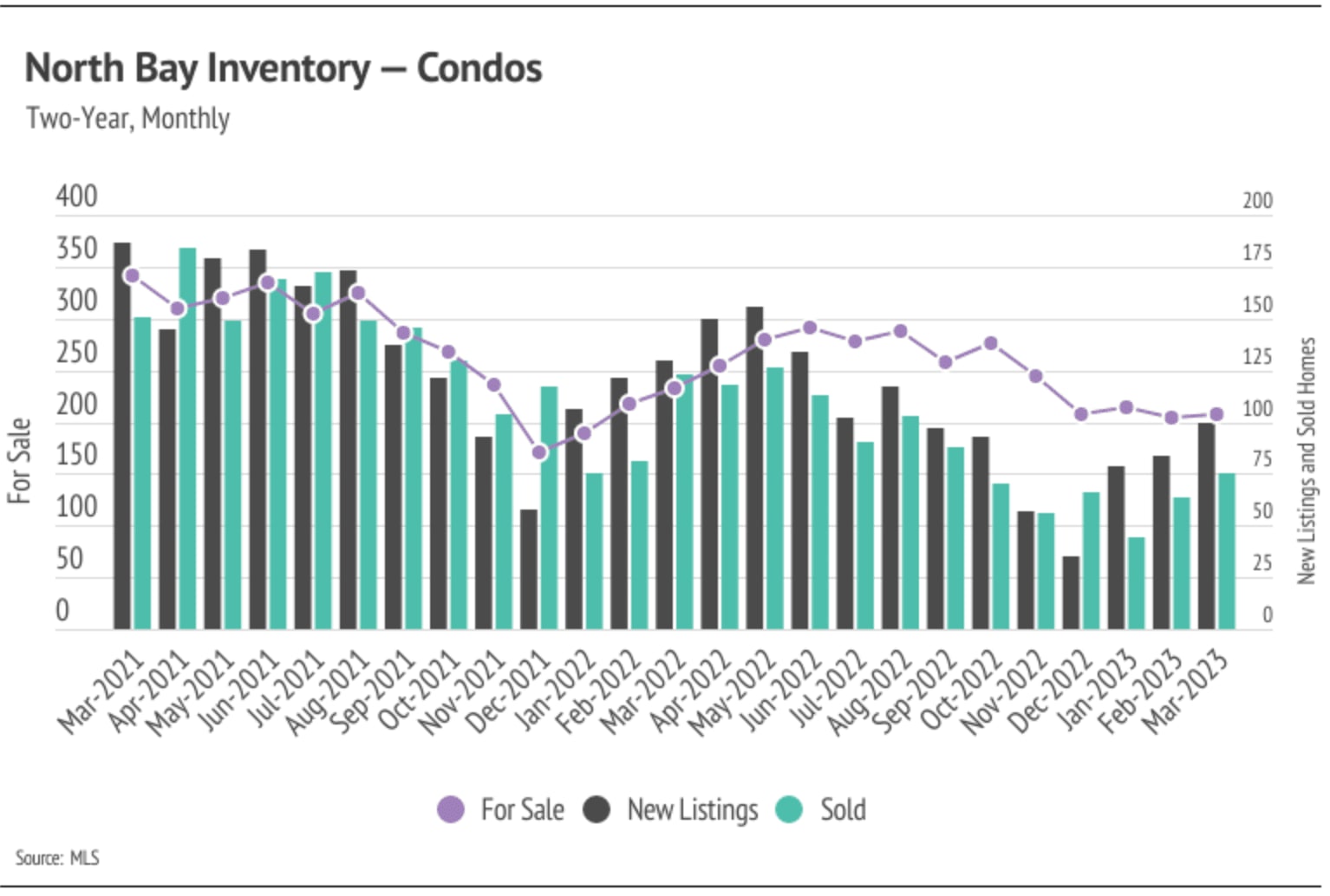 • Active listings in the North Bay rose in February and March, showing signs that inventory will follow normal seasonal trends, albeit at depressed levels.