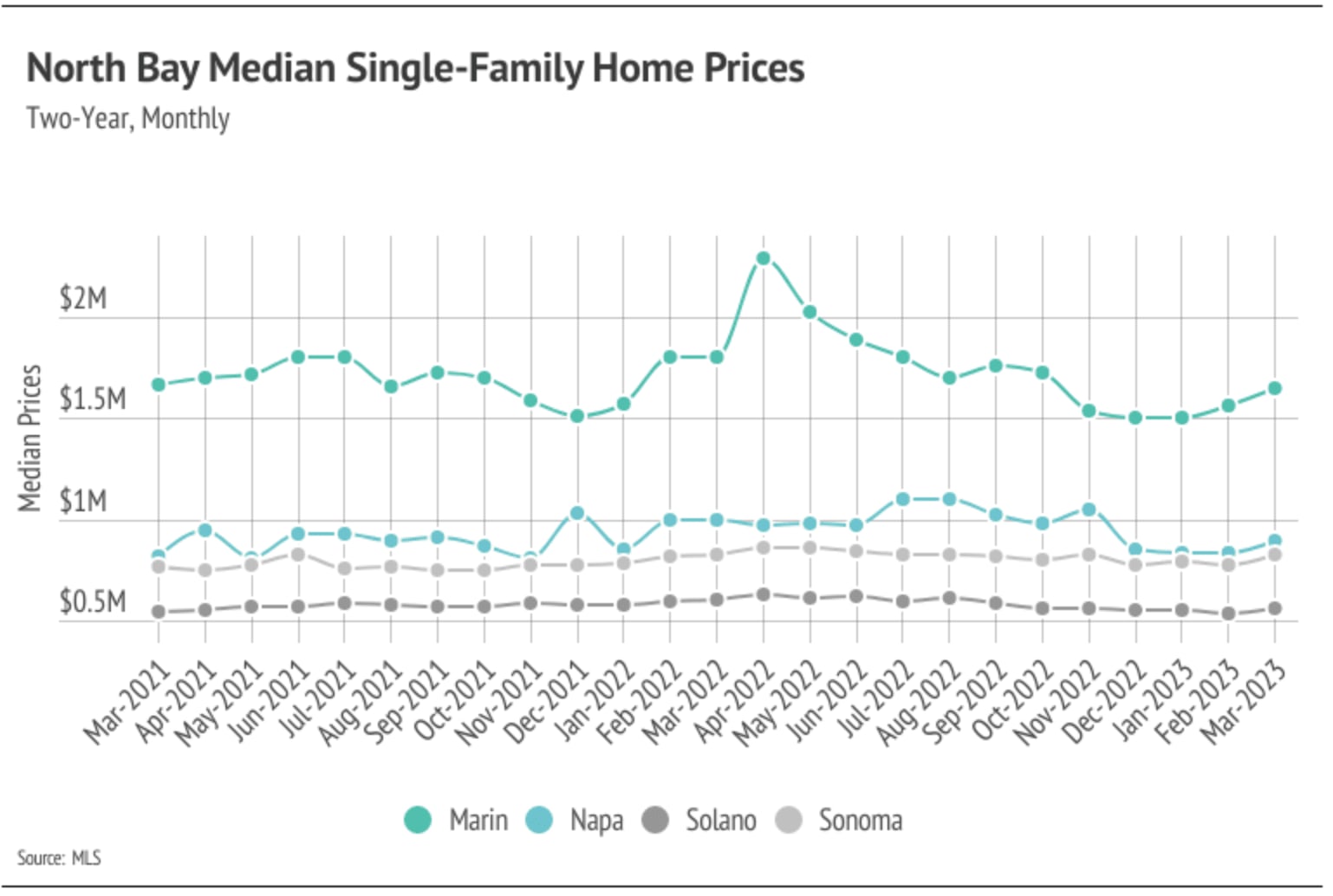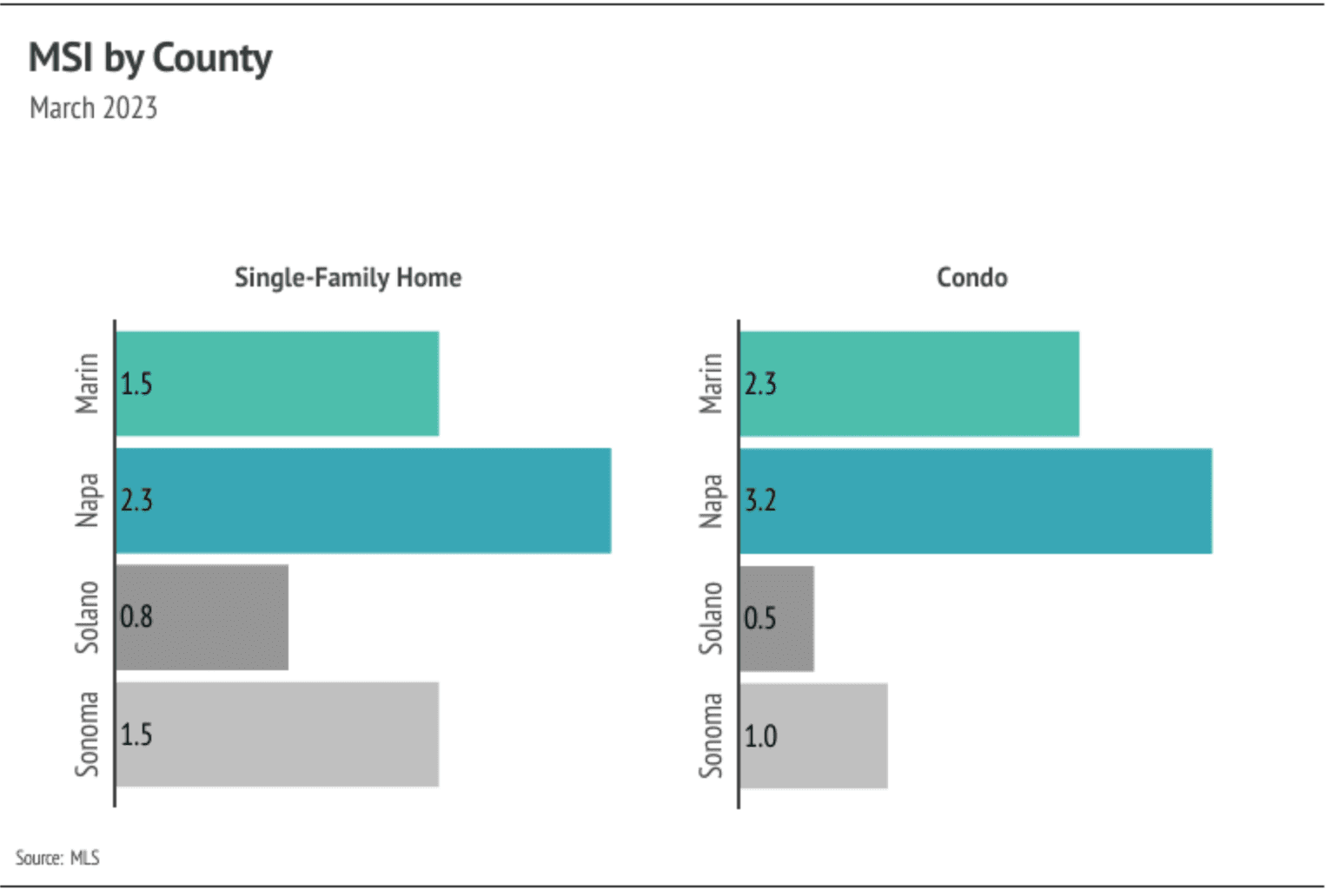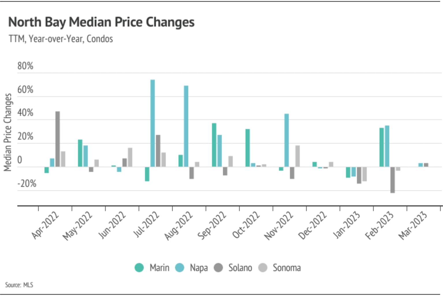 Every year, by at least March, we expect to see inventory rise after a high number of new listings come to market, which easily accommodate the increase in sales we also tend to see in the first half of the year. Inventory in the North Bay, thankfully, increased in February and March, unlike the inventory in many other major markets, which is continuing to decline. Typically, inventory grows in the first half of the year, peaking in June or July. The North Bay has enough demand that many more homes could come to market before the market would balance between buyers and sellers. Currently, sales are still below last year’s level, but we expect sales to climb higher in the second quarter with more homes coming to market. As demand increases, competition among buyers and housing prices will climb with it. Home prices in the North Bay are still significantly below their all-time highs, except for Solano single-family homes and condos, which are just below peak. If active listings unexpectedly plateaus or drop in the second quarter, we could easily see single-family-home and condo prices rise significantly into the summer.