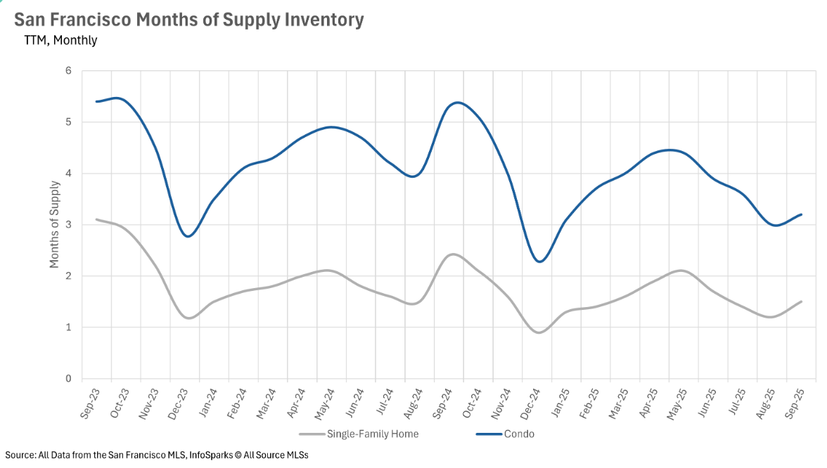 While the single-family home market has been a heavily entrenched seller's market for quite some time (and it still is, with just 1.5 months of inventory on the market), the condo market has traditionally been more buyer-friendly. However, it’s been creeping closer toward being a seller's market as of late, with the condo market reporting just 3.2 months' worth of active inventory on the market in September.