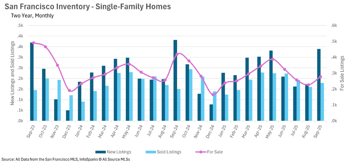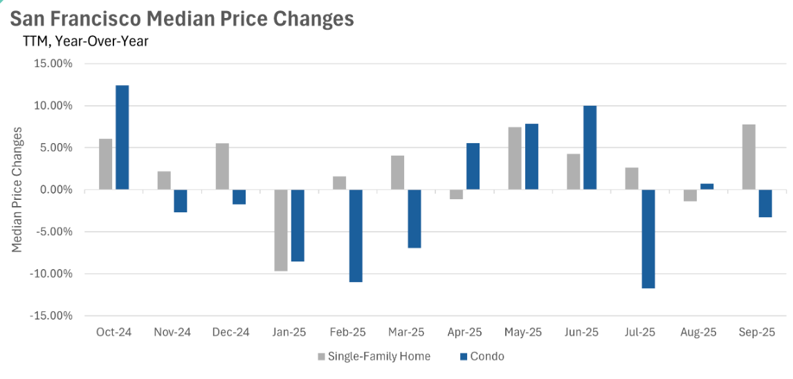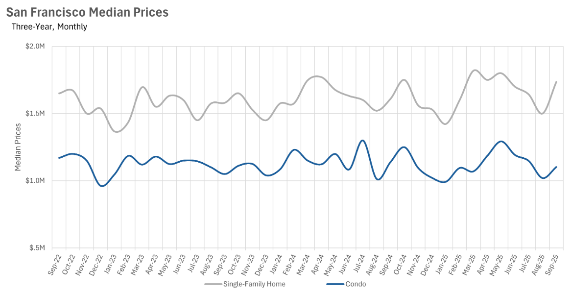 • Last month we saw a big upward swing in median sale prices for single-family homes in San Francisco