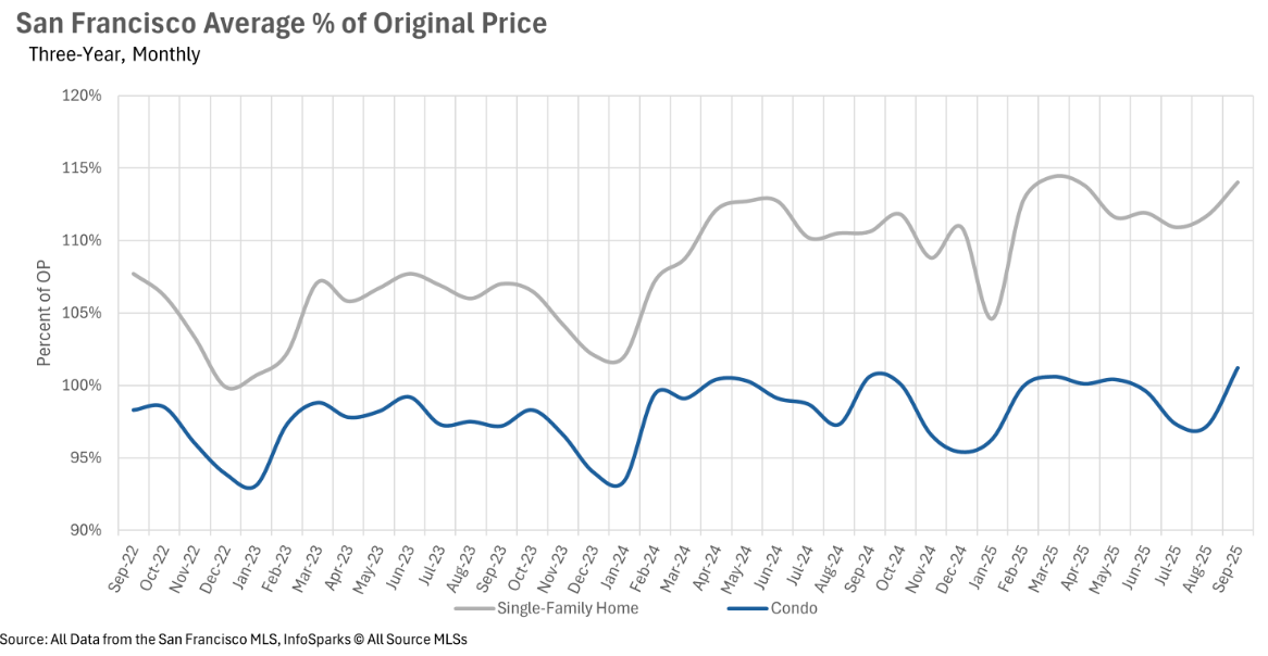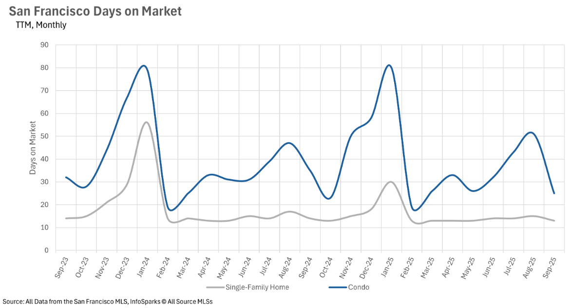 As you might expect, when inventories shrink, the market becomes much more competitive, which is certainly the dynamic that we are watching play out in San Francisco. The average single-family home is spending just 13 days on the market, representing a 7.14% year-over-year decrease. By the same token, the average condo listing is spending just 25 days on the market, representing a 28.57% year-over-year decrease and a 50.98% month-over-month decrease.