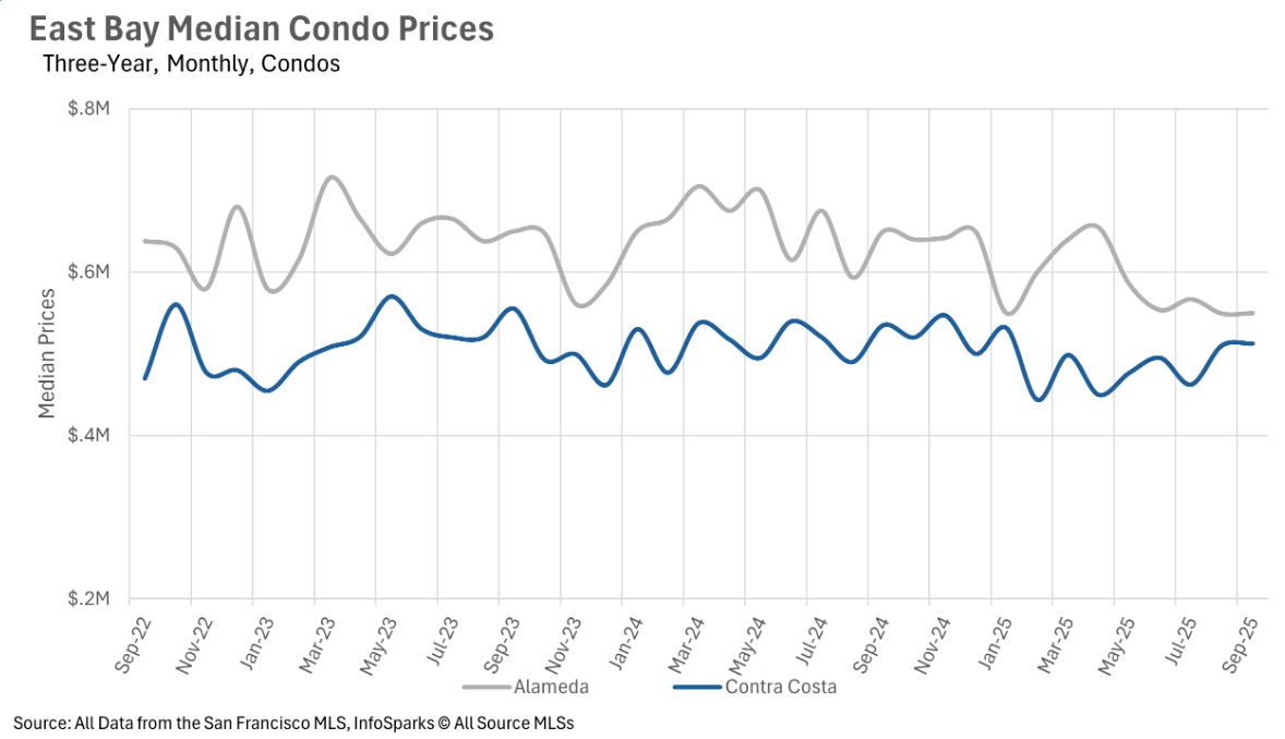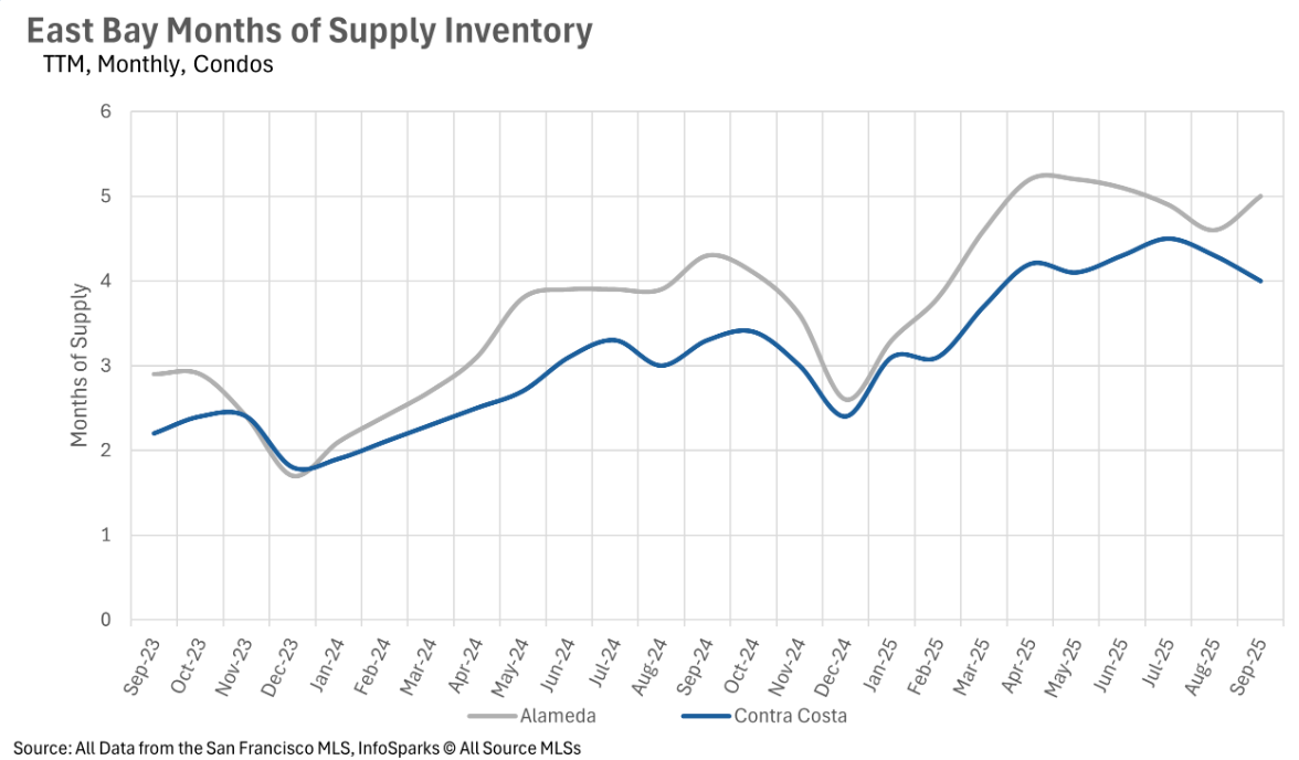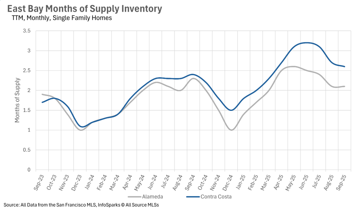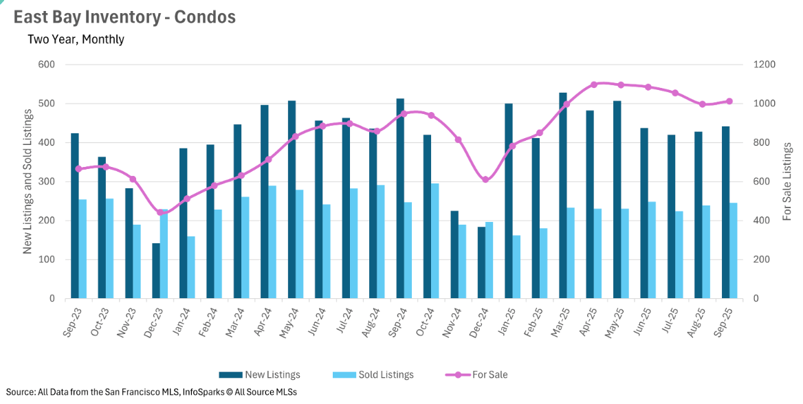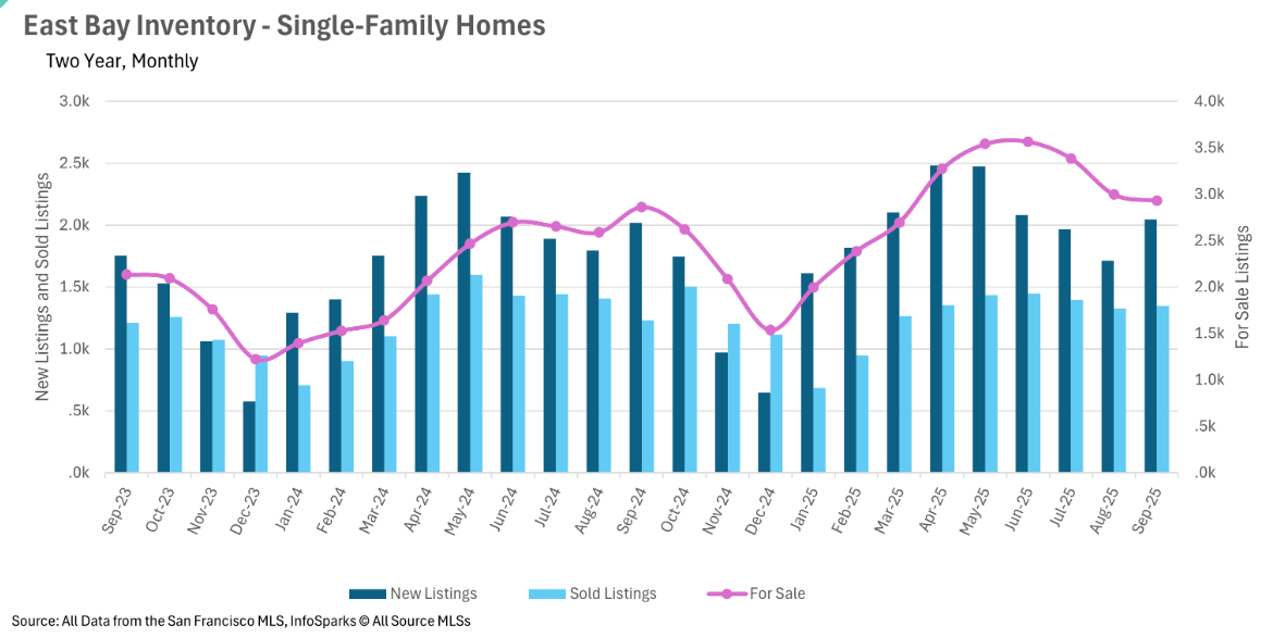 The North Bay experienced its first year-over-year inventory decline in several months, with single-family listings down 2.98%, driven by a sharp 14.75% drop in new listings and a 3.95% increase in sold listings, resulting in a dramatic 12.14% month-over-month inventory decline. Condo inventory remained slightly elevated at 3.49% above last year. The East Bay showed continued normalization with single-family inventory at just 2.41% above last year and condos at 6.75% above, both representing substantial improvements from summer peaks. The normalization was aided by nearly 10% more single-family homes sold in September compared to last year.