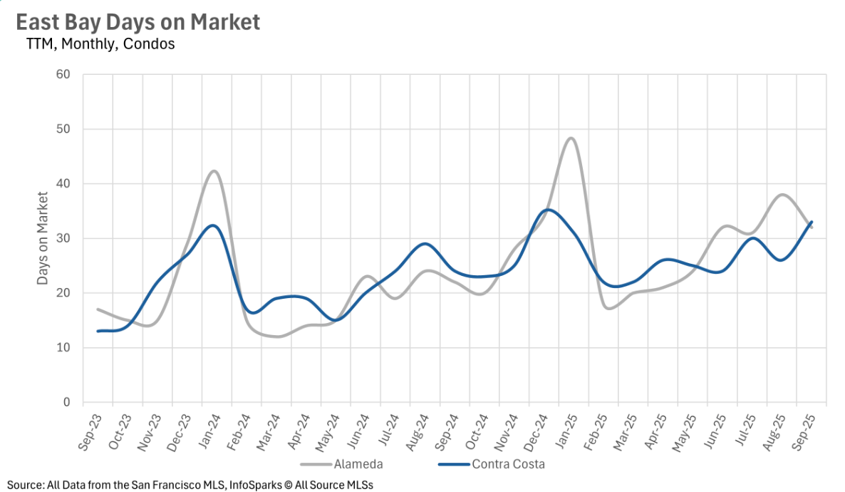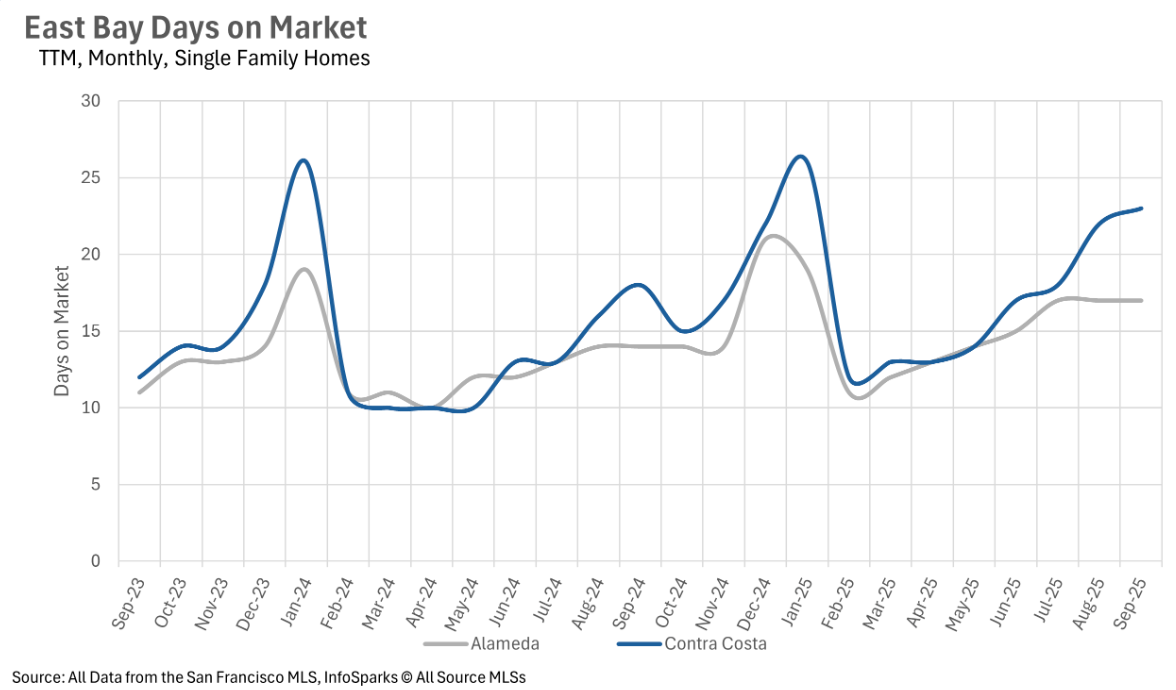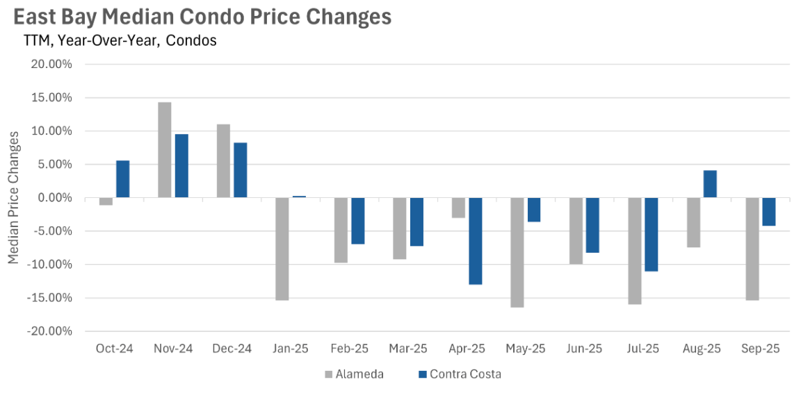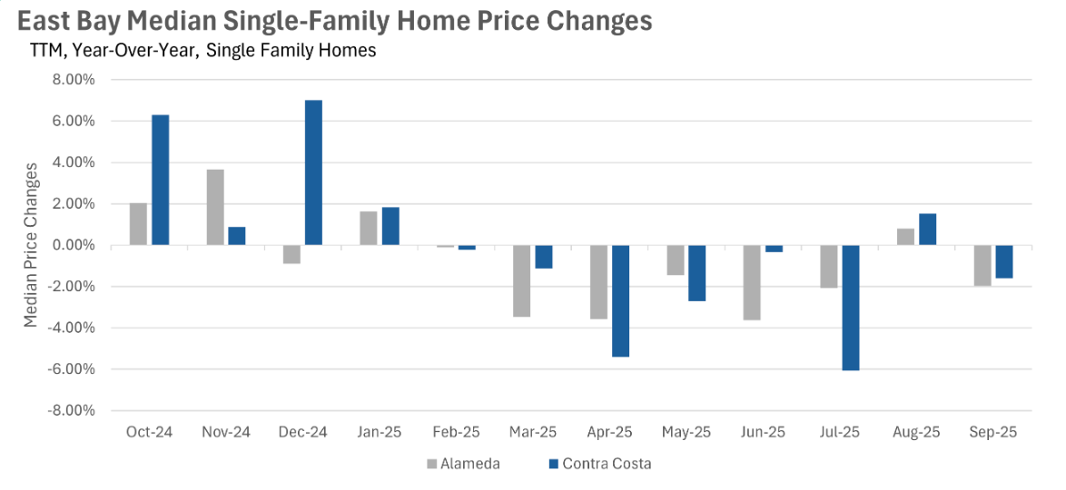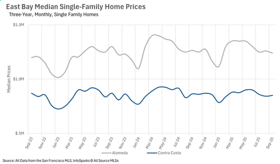 The North Bay experienced its first year-over-year inventory decline in several months, with single-family listings down 2.98%, driven by a sharp 14.75% drop in new listings and a 3.95% increase in sold listings, resulting in a dramatic 12.14% month-over-month inventory decline. Condo inventory remained slightly elevated at 3.49% above last year. The East Bay showed continued normalization with single-family inventory at just 2.41% above last year and condos at 6.75% above, both representing substantial improvements from summer peaks. The normalization was aided by nearly 10% more single-family homes sold in September compared to last year.