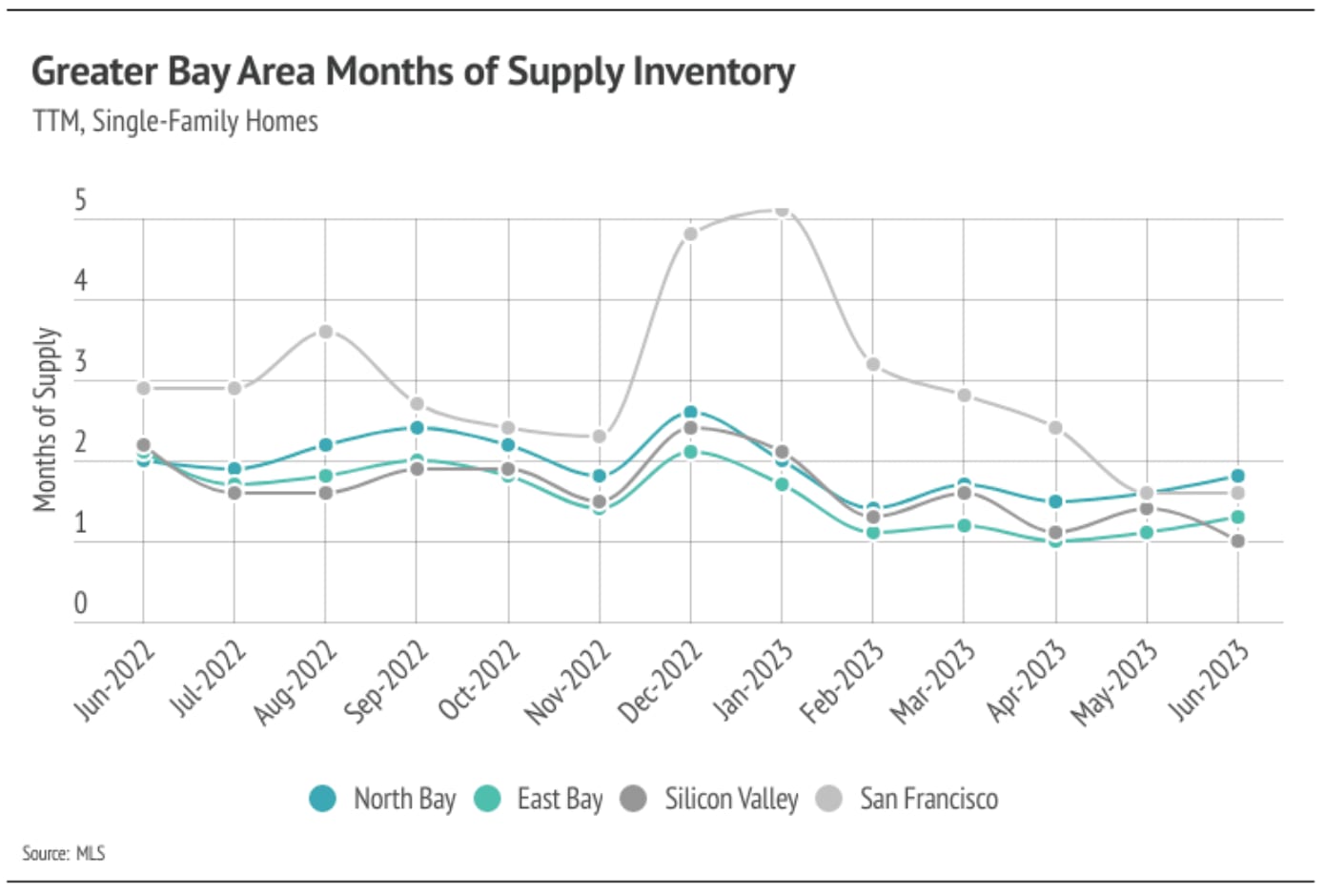 Months of Supply Inventory is under two months in June across the Bay Area, indicating a strong sellers’ market