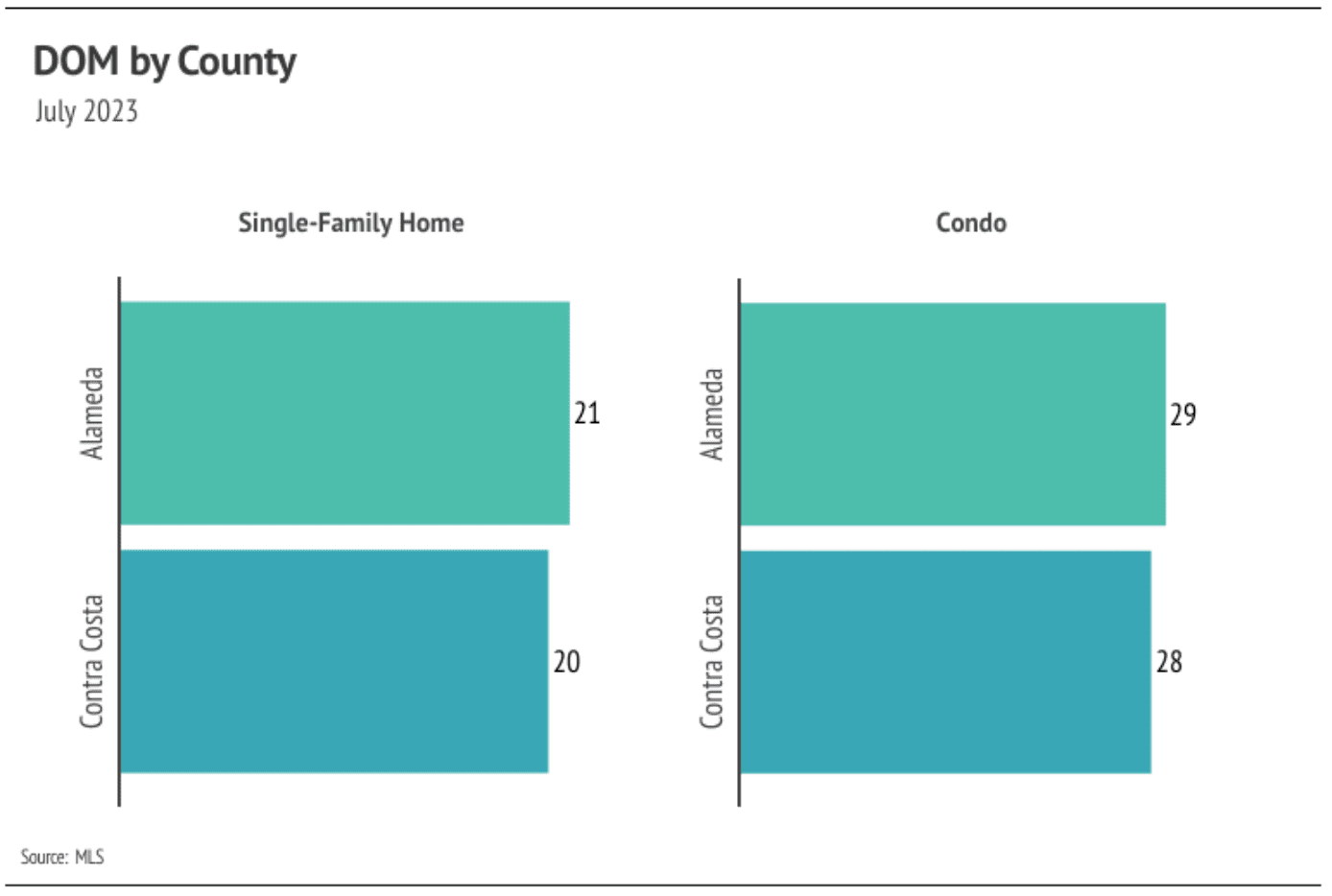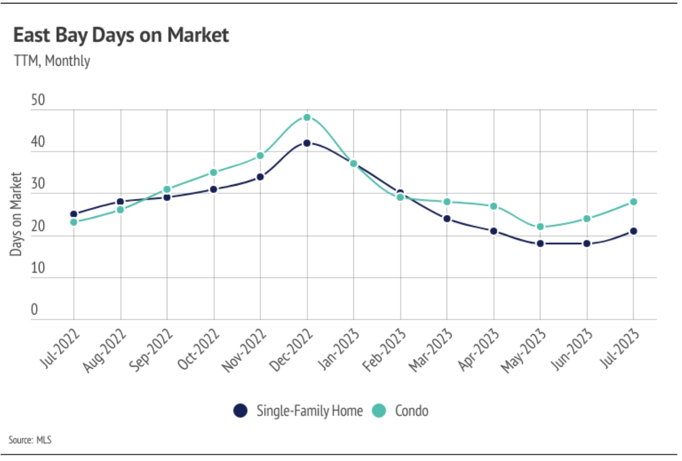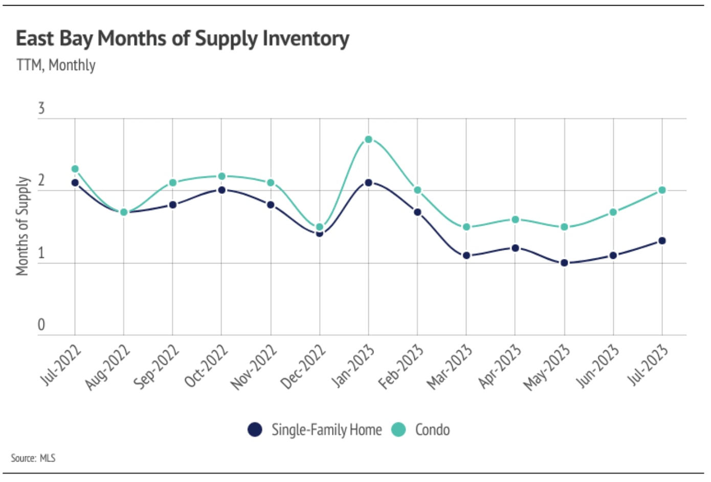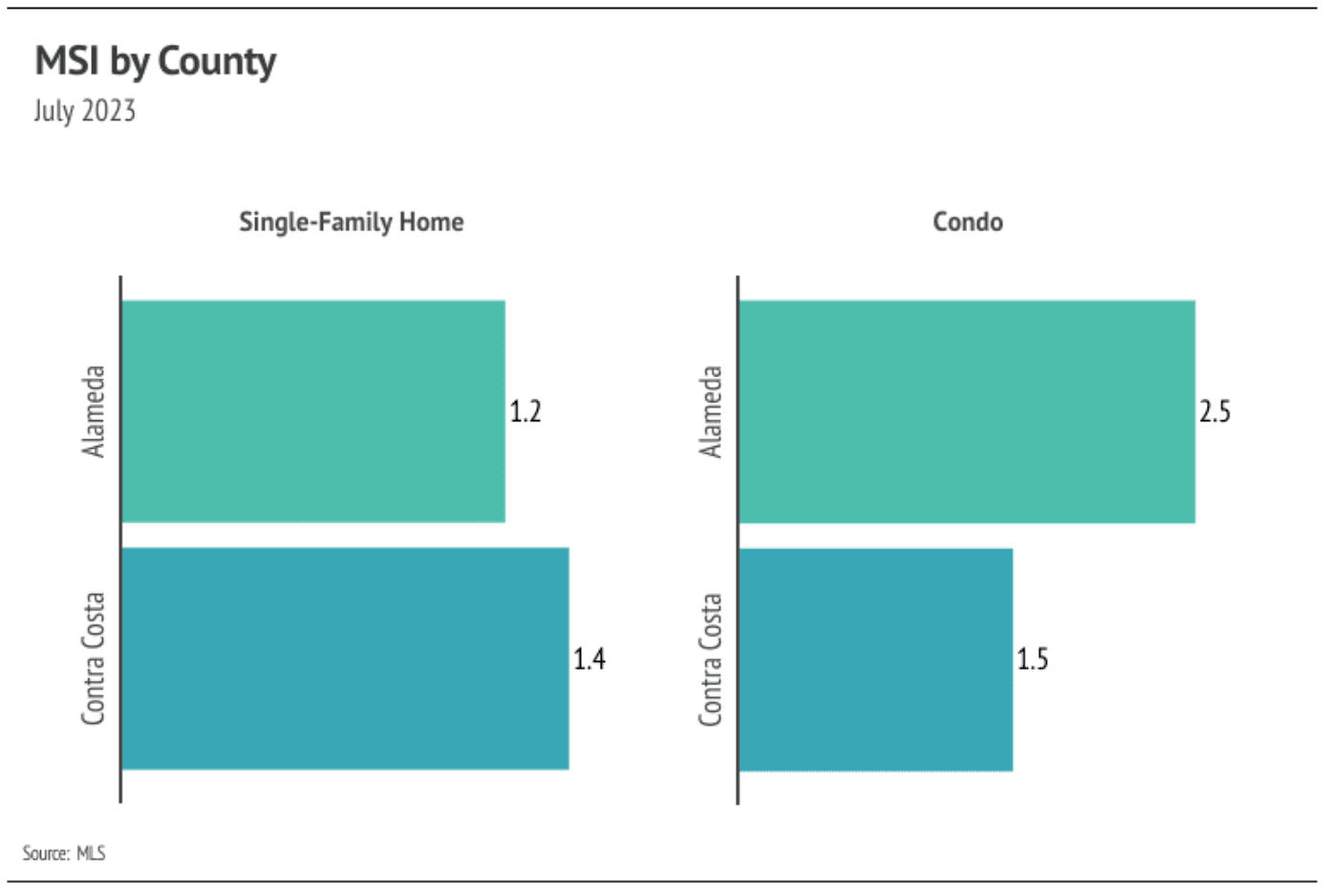 Months of Supply Inventory (MSI) quantifies the supply/demand relationship by measuring how many months it would take for all current homes listed on the market to sell at the current rate of sales. The long-term average MSI is around three months in California, which indicates a balanced market. An MSI lower than three indicates that there are more buyers than sellers on the market (meaning it’s a sellers’ market), while a higher MSI indicates there are more sellers than buyers (meaning it’s a buyers’ market). The East Bay market tends to favor sellers, which is reflected in its low MSI. MSI trended lower from January to May 2023 for both single-family homes and condos. Even with the slight increase in MSI in June and July, the market still firmly favors sellers. The sharp drop in MSI occurred due to the higher proportion of sales relative to active listings and less time on the market.