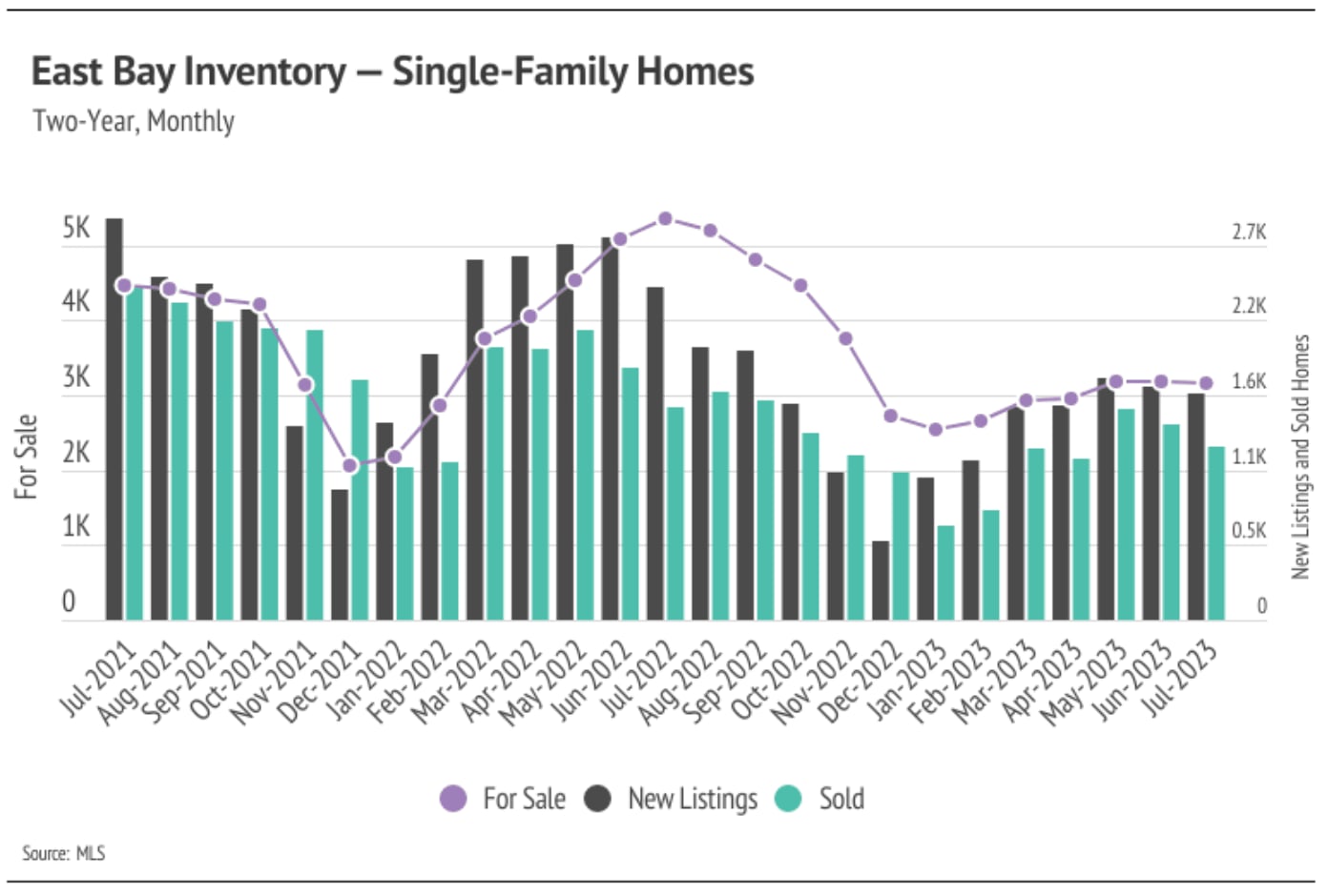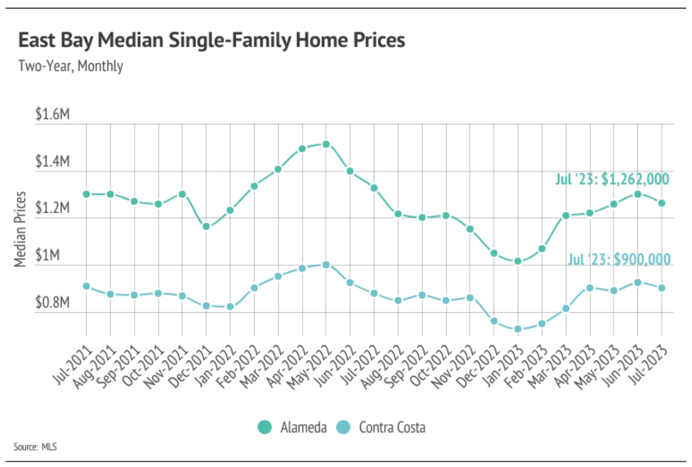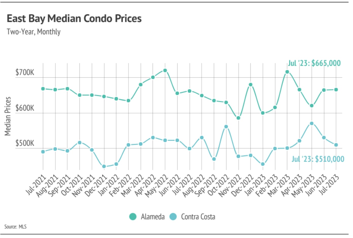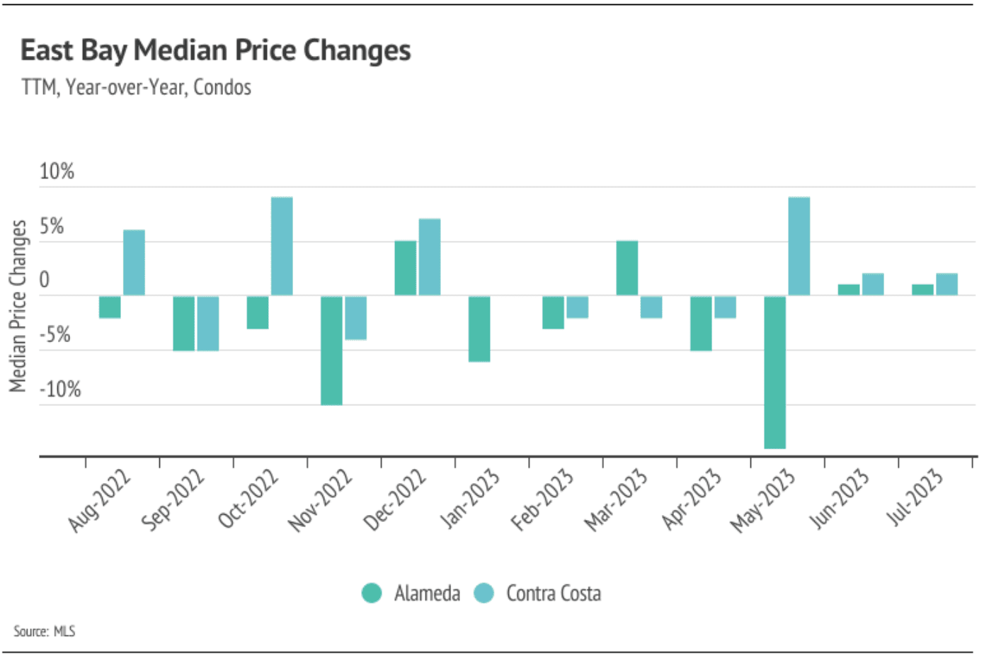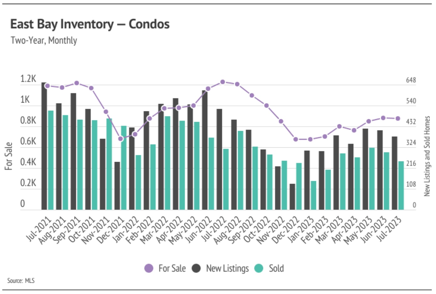 Months of Supply Inventory (MSI) quantifies the supply/demand relationship by measuring how many months it would take for all current homes listed on the market to sell at the current rate of sales. The long-term average MSI is around three months in California, which indicates a balanced market. An MSI lower than three indicates that there are more buyers than sellers on the market (meaning it’s a sellers’ market), while a higher MSI indicates there are more sellers than buyers (meaning it’s a buyers’ market). The East Bay market tends to favor sellers, which is reflected in its low MSI. MSI trended lower from January to May 2023 for both single-family homes and condos. Even with the slight increase in MSI in June and July, the market still firmly favors sellers. The sharp drop in MSI occurred due to the higher proportion of sales relative to active listings and less time on the market.